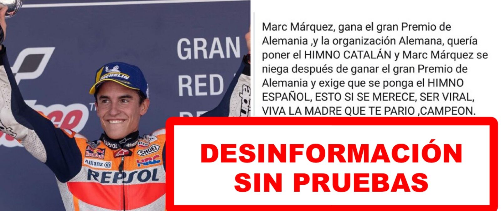 Está circulando por redes sociales una imagen que afirma que Marc Márquez, piloto de MotoGP, tuvo que exigir en el Gran Premio de Alemania, celebrado el pasado 7 de julio, que sonara el himno español porque la "organización alemana quería poner el himno catalán". El mensaje que se difunde es el siguiente: