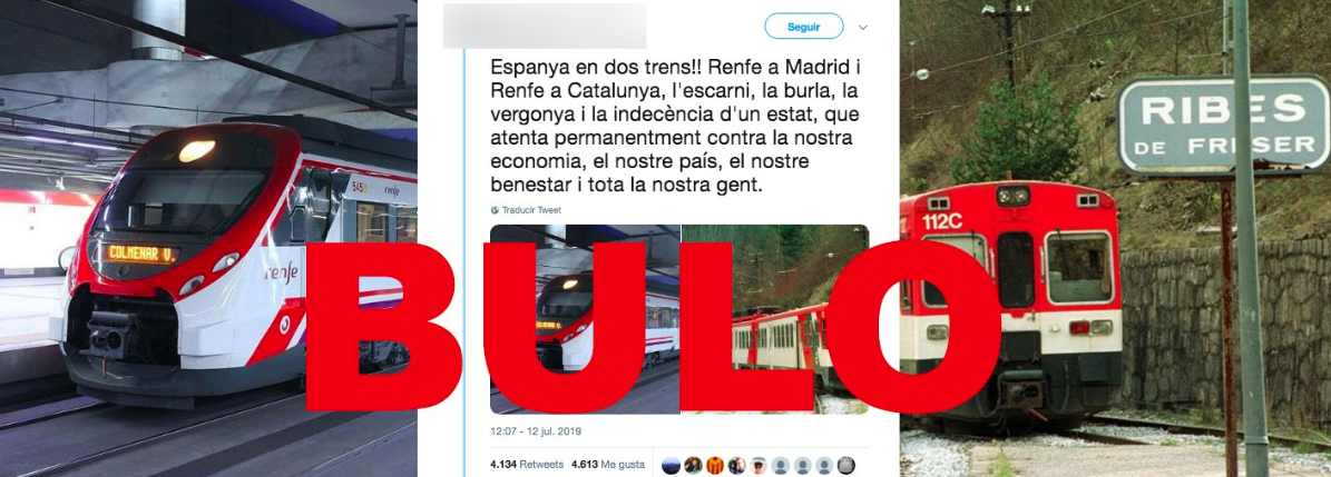 Un tuit, con más de 4.000 compartidos, muestra dos fotografías de trenes y afirma que la primera imagen corresponde a un tren de Renfe en Madrid y la segunda a un tren de Renfe en Cataluña. El mensaje del tuit es el siguiente: