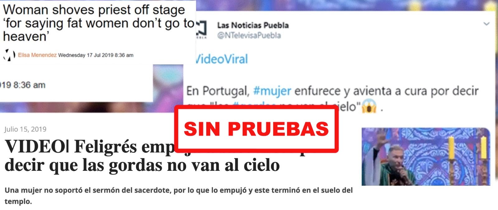 Diferentes plataformas, webs y cuentas de redes sociales han compartido un vídeo en el que supuestamente “una mujer feminista empuja a un sacerdote en Portugal por haber dicho durante su sermón que ‘las gordas no van al cielo’”. Es un bulo y no sólo se está moviendo en España. También hemos visto que circula por Brasil, México, Reino Unido y Turquía.*
