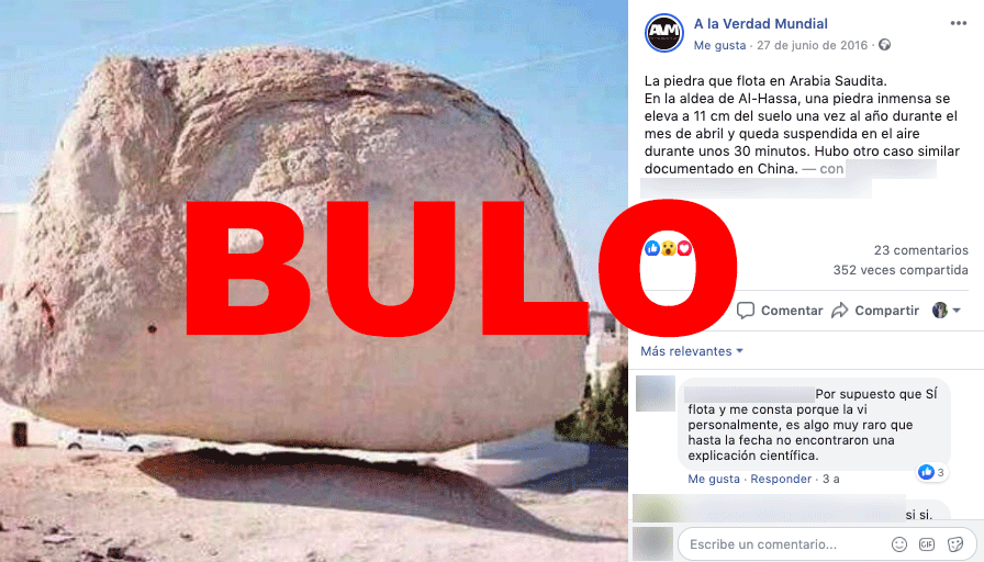 Se está viralizando en redes la foto de una roca que supuestamente flota en Al-Hassa (Arabia Saudita), con un texto que asegura que "se eleva a 11 cm del suelo una vez al año durante el mes de abril y queda suspendida en el aire durante unos 30 minutos". No es cierto.