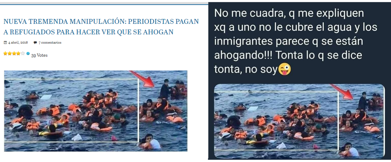 Otras webs como Somatemps o LodehoyRd.com aseguran en su cabecera que detrás de las imágenes "hay periodistas que pagan a refugiados para hacer ver que se ahogan" y añaden que "en la foto que presentamos se puede ver claramente una multitud que disimula [sic] estar en peligro por no tocar fondo con los pies".
