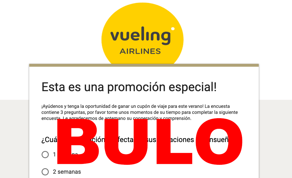 Hace unas semanas desmentimos un supuesto sorteo de Vueling por el que daban la oportunidad de ganar un "cupón de viaje para el próximo verano" si respondías a un formulario de Google Docs, pero que en realidad era sólo una forma de hacerse con tus datos. Ahora ha vuelto a circular otro similar en el que vuelven a utilizar a la aerolínea, pero desde Vueling nos dicen que el sorteo es "ajeno" a la empresa y que su "equipo legal ya lo ha reportado a Google".