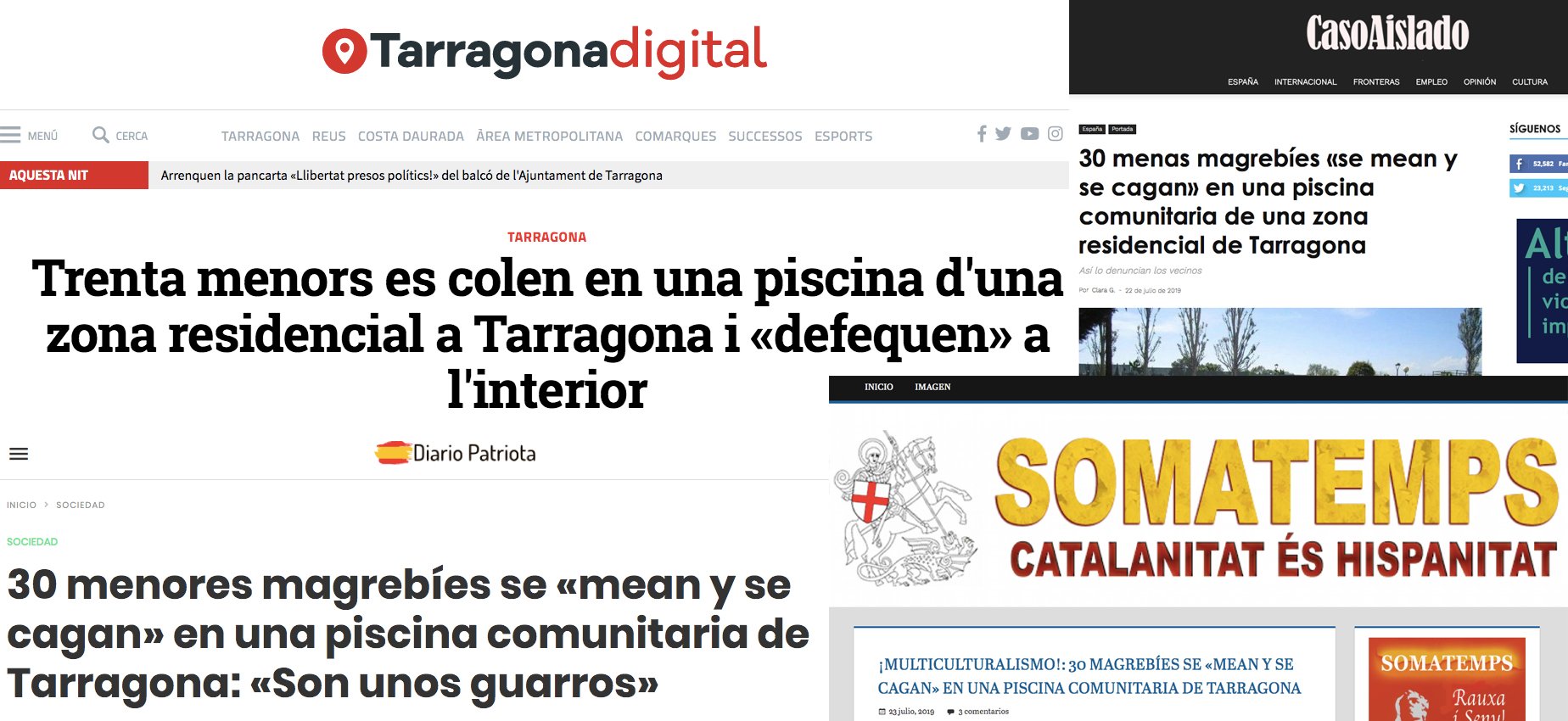 El pasado lunes 22 de julio, Tarragona Digital publicó un artículo en el que titulaba: "Treinta menores se cuelan en una piscina de una zona residencial en Tarragona y «defecan» en el interior". En el primer párrafo se puntualiza que, "según diferentes fuentes consultadas", se trataba de "menores magrebíes". Según la publicación, el incidente ocurrió la noche del 11 al 12 de julio en el complejo residencial Torres Roma. Hemos encontrado este contenido publicado también en webs como Diario Patriota, Somatemps y Caso Aislado.