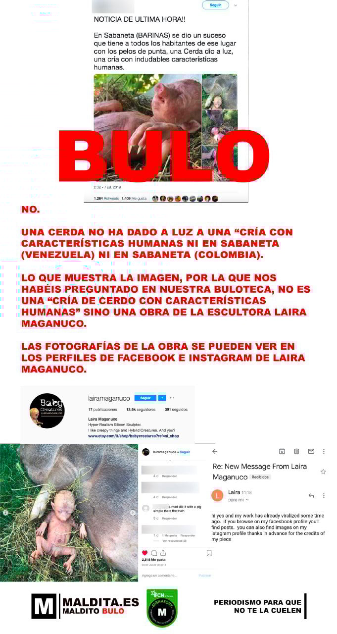 - Lo que muestra la imagen, por la que nos habéis preguntado en nuestra buloteca, no es una "cría de cerdo con características humanas" sino una obra de la escultora Laira Maganuco.