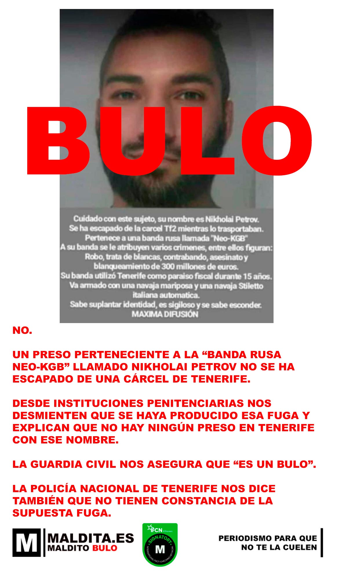 «[T] No, un preso perteneciente a la "banda rusa Neo-KGB" llamado Nikholai Petrov no se ha escapado de una cárcel de Tenerife»