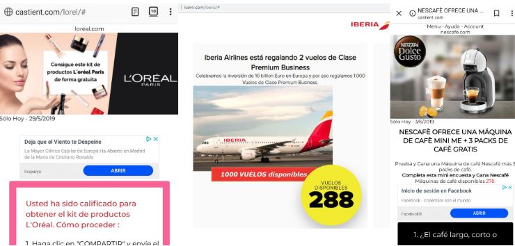 Últimamente nos hemos encontrado con estas falsas ofertas en unas "webs mutantes": son páginas que publicitan promociones engañosas, que se actualizan solas y que se van redireccionando de unas a otras con distintas ofertas falsas. Hablamos de páginas como castient.com, ouyoul.com o luovir.com.