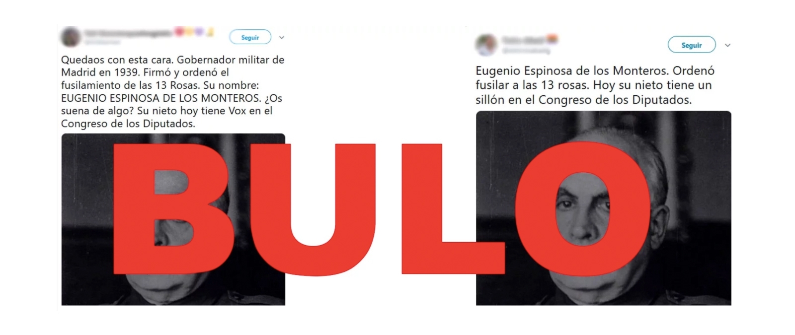 Tras el 80º aniversario del fusilamiento de las conocidas como las Trece Rosas, que se produjo el 5 de agosto de 1939 en Madrid, se ha viralizado en Twitter que el gobernador militar de Madrid en 1939, Eugenio Espinosa de los Monteros ,"firmó y ordenó el fusilamientos de las 13 rosas" y que su nieto es el diputado de Vox Iván Espinosa de los Monteros.