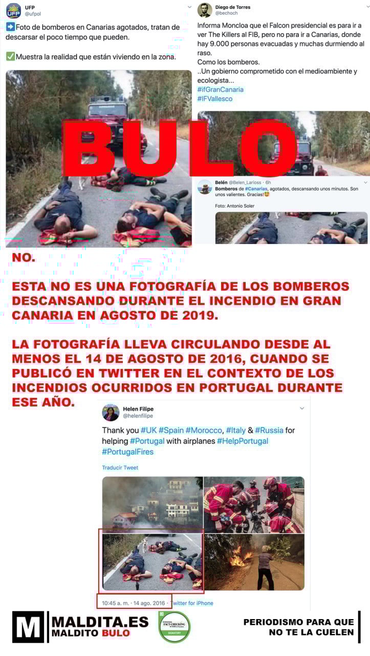 «[T] No, esta no es una fotografía de los bomberos descansando durante el incendio en Gran Canaria en agosto de 2019»