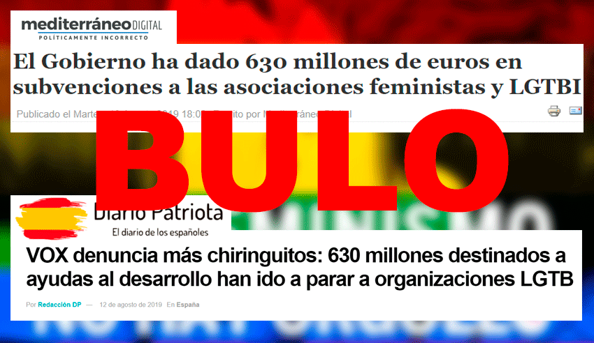 Nos habéis hecho llegar un contenido de Mediterráneo Digital que circula en redes sociales y que titula con el siguiente mensaje: “el Gobierno ha dado 630 millones de euros en subvenciones a las asociaciones feministas y LGTBI”. En ese sentido, la web Diario Patriota añade en su titular que “Vox denuncia más chiringuitos” porque los “630 millones destinados a ayudas al desarrollo han ido a parar a organizaciones LGTB”. Es un bulo.