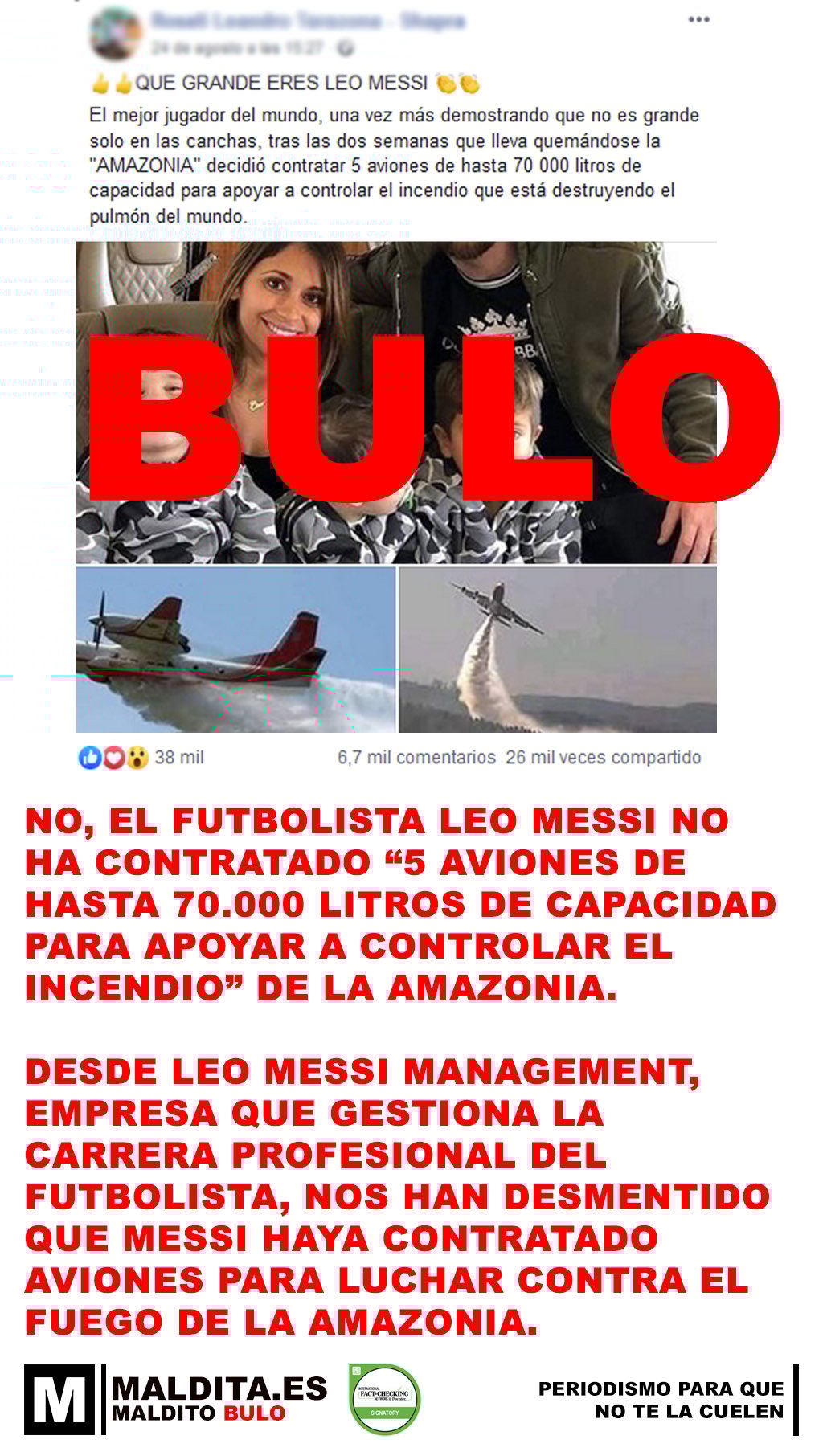 «[T] No, el futbolista Leo Messi no ha contratado "5 aviones de hasta 70.000 litros de capacidad para apoyar a controlar el incendio" de la Amazonia»