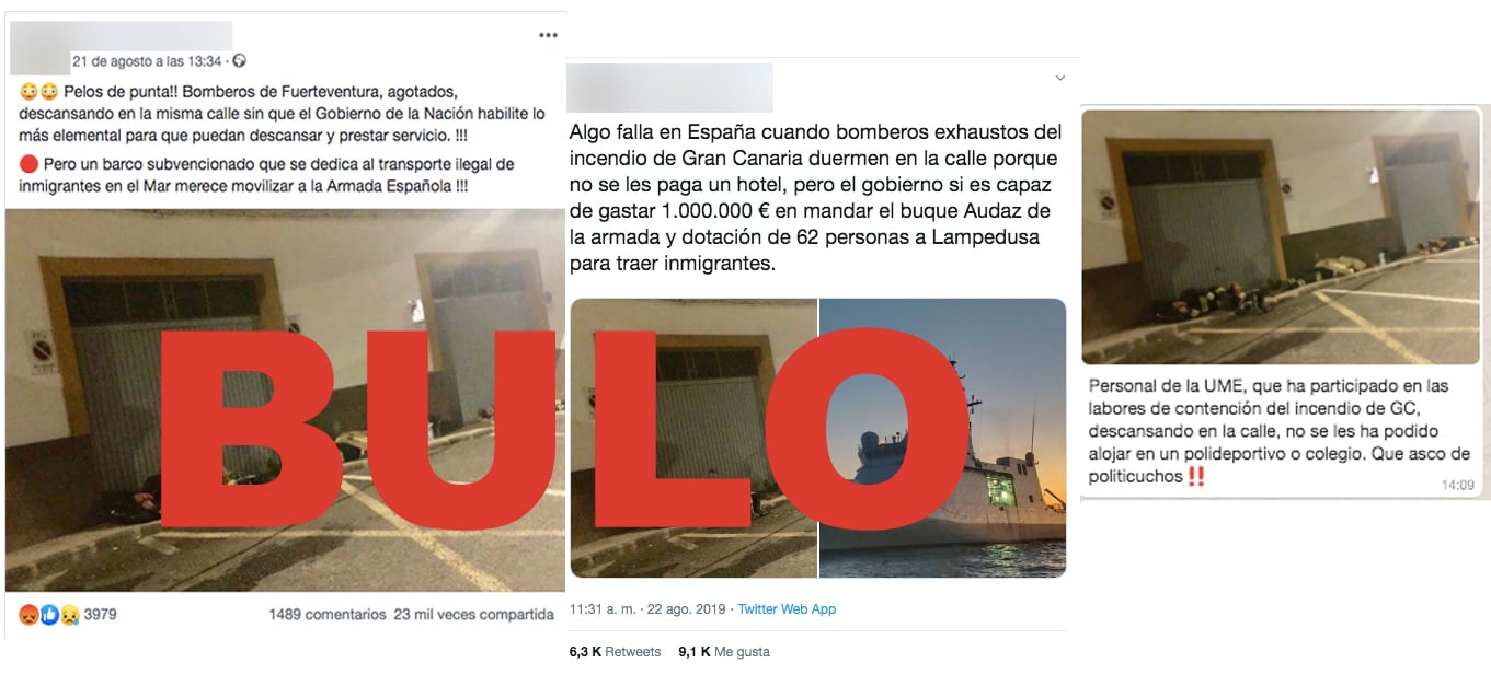 También se ha difundido un tuit que defiende que "los bomberos de Gran Canaria duermen en la calle porque no se les paga un hotel". Incluso circula una cadena de WhatsApp que asegura que los que aparecen en la foto son personal de la Unidad Militar de Emergencias (UME) al que "no se ha podido alojar en un polideportivo o colegio".
