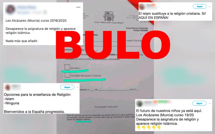 Se está volviendo a viralizar la imagen de una circular del colegio Bienvenido Conejero Requiel (Los Alcázares, Murcia) donde se ofrece a los alumnos elegir entre la enseñanza islámica y la asignatura de valores cívicos. La imagen va acompañada de distintos textos en los que se afirma que la religión católica dejará de impartirse en dicha escuela. No es cierto, es bulo que ya circuló en mayo y que ahora vuelve.