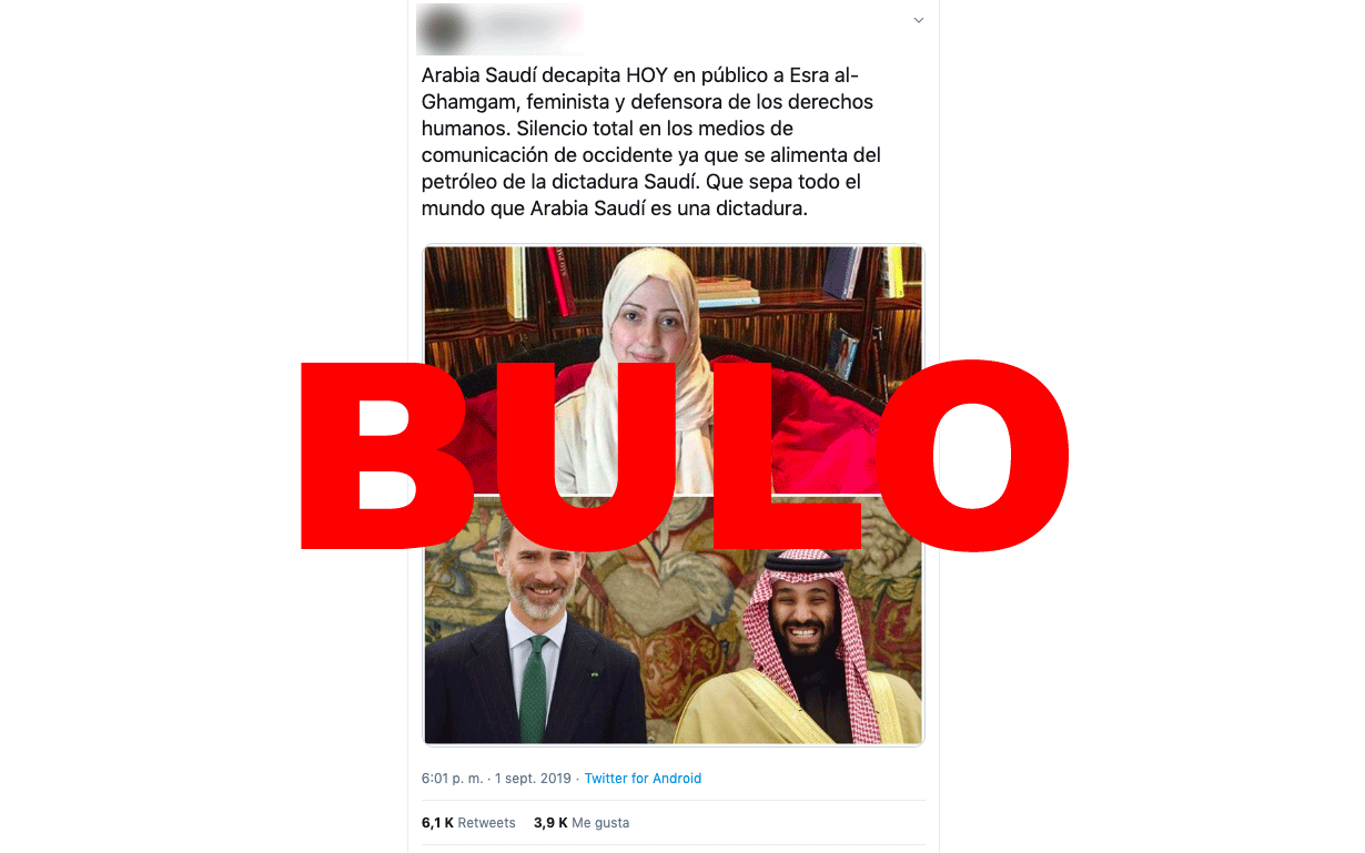 Uno de los bulos que vuelve con frecuencia es el de la supuesta decapitación de la activista Isra al-Ghamgam en Arabia Saudí (también circula como Esra al-Ghamgam, con 'e'). Pese a que en el último año ya lo hemos desmentido en dos ocasiones, se ha vuelto a viralizar en redes a través de un tuit publicado este 1 de septiembre que tiene 6.000 retuits. También nos habéis preguntado por ello en nuestro servicio de WhatsApp (655 198 538).