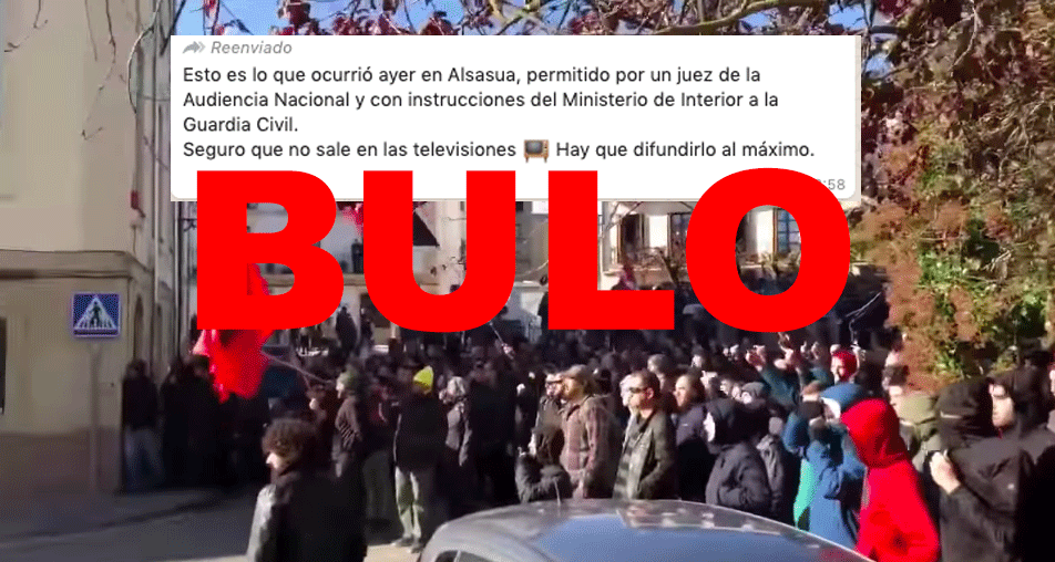 Unos días después de que se celebrara la concentración empezó a circular por WhatsApp un vídeo en el que un grupo de personas increpa a otra que ondea una bandera de España, ante la presencia de la Guardia Civil y la Policía Foral de Navarra. Esas imágenes se están difundiendo como si hubieran sido grabadas en dicho acto, pero es en realidad una grabación del 4 de noviembre de 2018, durante un acto en el municipio navarro en el que participaron PP, Ciudadanos y Vox.