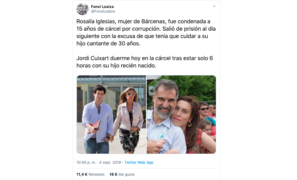 Se está viralizando un tuit en el que se asegura que Rosalía Iglesias, la mujer del extesorero del Partido Popular, Luis Bárcenas, "fue condenada a 15 años de cárcel por corrupción" y salió al día siguiente "con la excusa de que tenía que cuidar a su hijo cantante de 30 años".