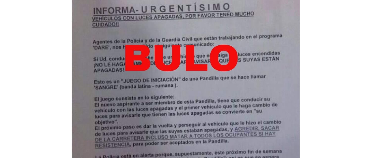 No, no existe una "pandilla de las luces apagadas". El bulo vuelve una y otra vez y tanto Guardia Civil como Policía Nacional no se cansan de intentar pararlo. Ya lo desmentimos en 2017 y ahora regresa de nuevo con un documento falso que atribuyen a la Jefatura Provincial de Tráfico de La Rioja. No es real.