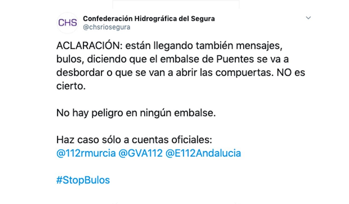 En un tuit publicado desde su cuenta oficial a las 22:45 de este 12 de septiembre, la CHS desmentía que el embalse de Puentes (Murcia) se fuera a desbordar o que se fueran "a abrir las compuertas". Además, explicaban que "no hay peligro en ningún embalse".