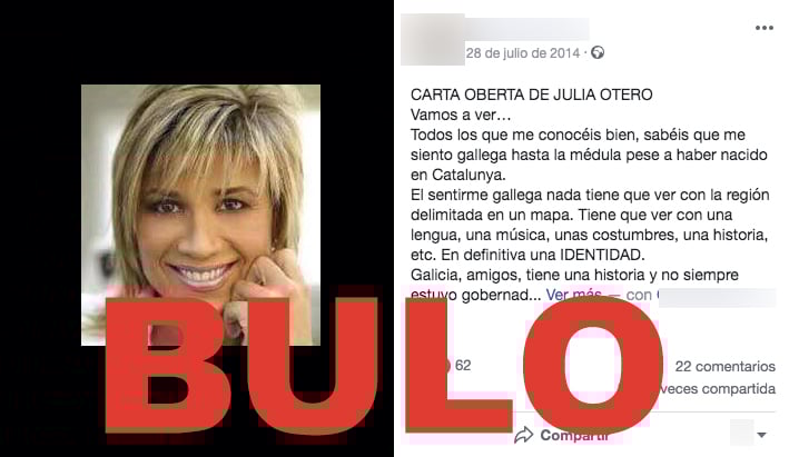 Sigue difundiéndose por redes sociales una supuesta "carta oberta" escrita por la periodista Julia Otero en la que reflexiona sobre la situación de Cataluña. Hemos dado con una publicación de Facebook con esta mensaje que se ha compartido más de 80.000 veces. El post viral del que os hablamos empieza así: