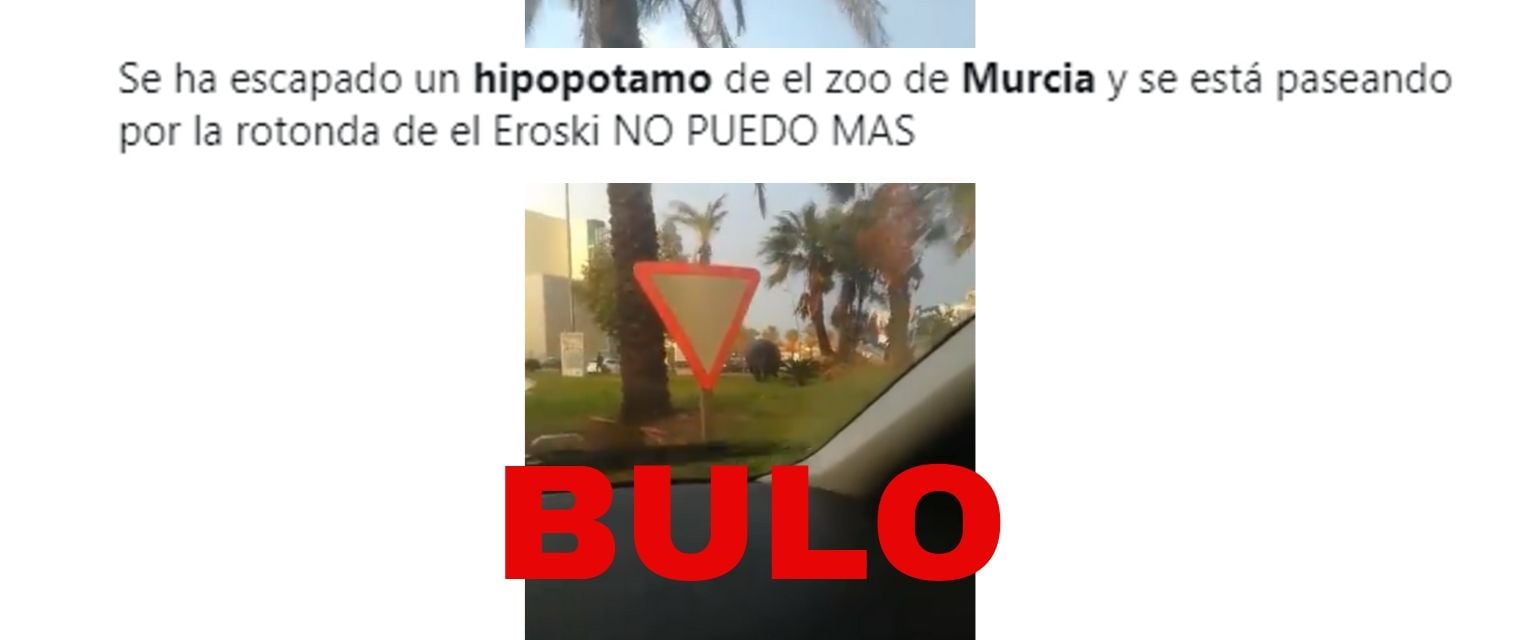 Algunos usuarios en redes están moviendo este vídeo de un hipopótamo en la calle y a plena luz del día como si estuviera sucediendo en Murcia: "hipopótamo del zoo de Murcia y se está paseando por la rotonda de el Eroski". Es un bulo.