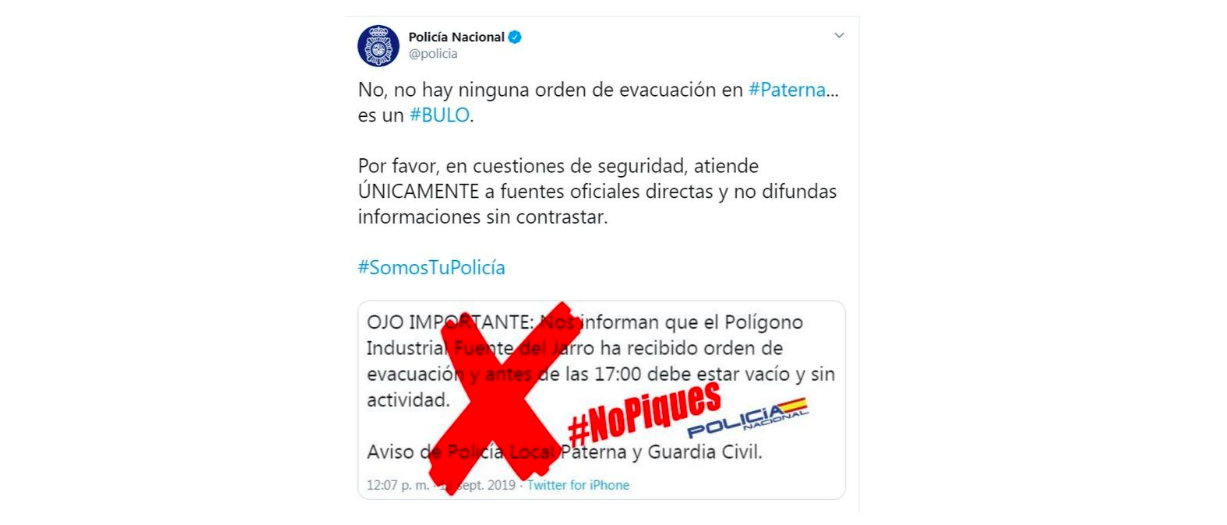 Mucho ojo si has recibido una cadena de WhatsApp en la que se dice que se ha ordenado la evacuación del Polígono Industrial Fuente del Jarro, en Paterna (Valencia), porque no es cierto.