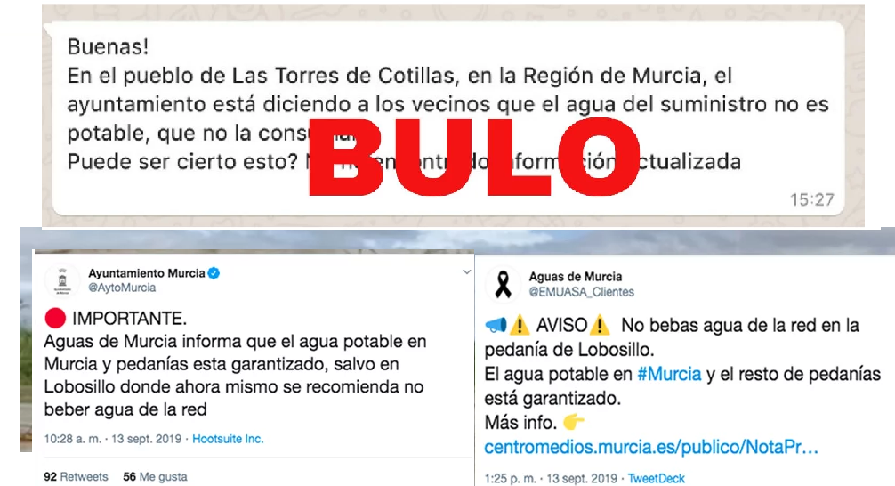 No, no es cierto que el agua no sea potable en el municipio murciano de Las Torres de Cotillas (a fecha de 13/09 a las 17:37)