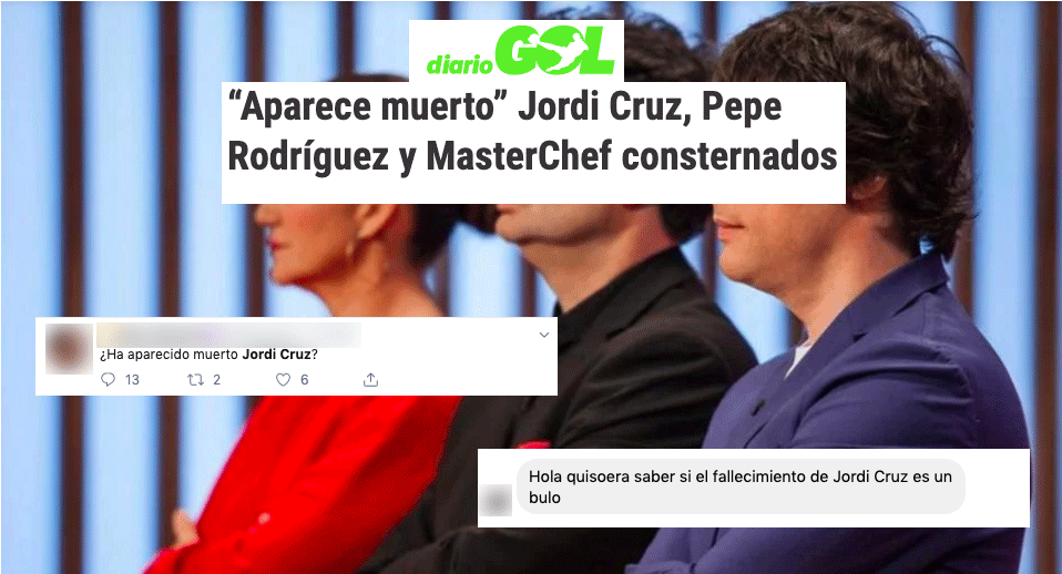 Vuelve el bulo de la muerte de Jordi Cruz. Todo empezó cuando la web Diario Gol publicó el pasado 23 de agosto un contenido titulado: " <<Aparece muerto>> Jordi Cruz, Pepe Rodríguez y Masterchef consternados" que se está moviendo como si Cruz, chef y juez del concurso de TVE, hubiera fallecido. No ha muerto.