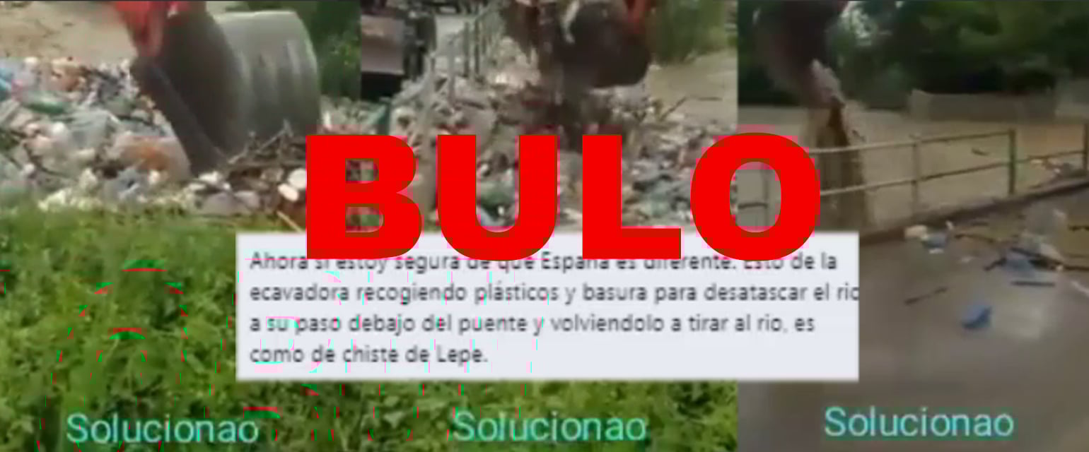 En este vídeo se ve gran cantidad de basura que baja por un río y que se ha quedado atrapada en un lado de un puente y cómo una excavadora la traslada al otro lado para que continúe su curso río abajo. En los últimos días, se ha difundido afirmando que se trata de un vídeo grabado en España y además se mueve en el contexto de las inundaciones provocadas por la DANA.