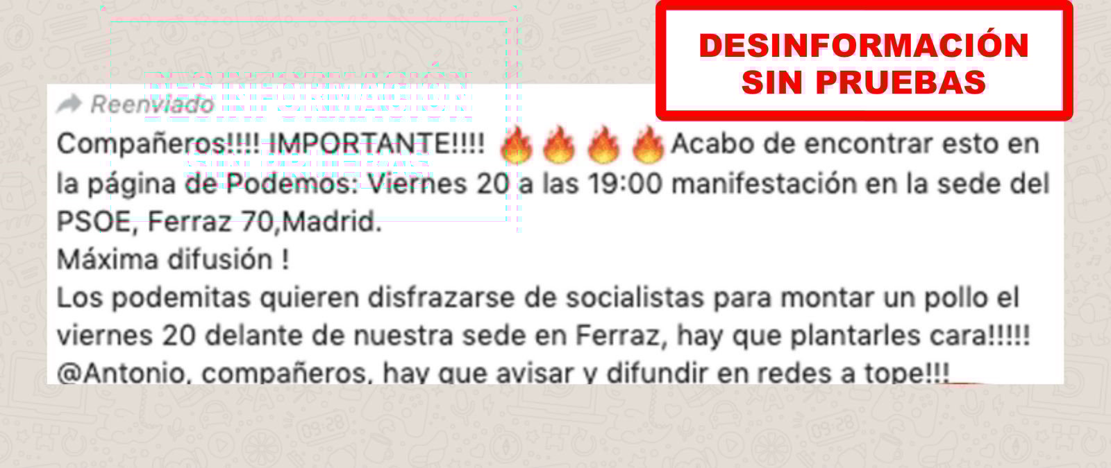 Está circulando en redes y WhatsApp una cadena que afirma que "en la página de Podemos" se ha convocado "una manifestación en la sede del PSOE" para este viernes, 20 de septiembre, a las 19:00. Según el mensaje, "los podemitas quieren disfrazarse de socialistas para montar un pollo", pero no hay ninguna prueba de ello.*