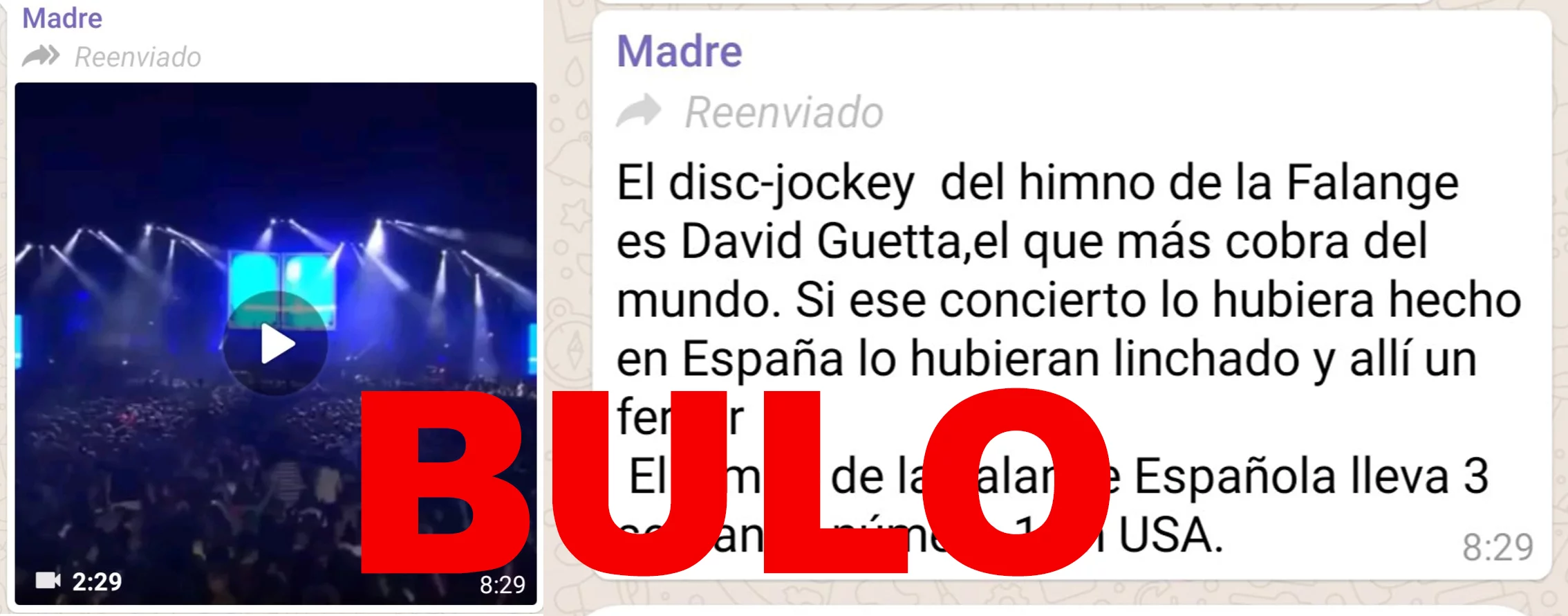 Se está difundiendo por WhatsApp un vídeo de una actuación del artista David Guetta en la que suena una versión de Cara al Sol. Es un bulo que vuelve. El mensaje que acompaña este vídeo, es el siguiente: