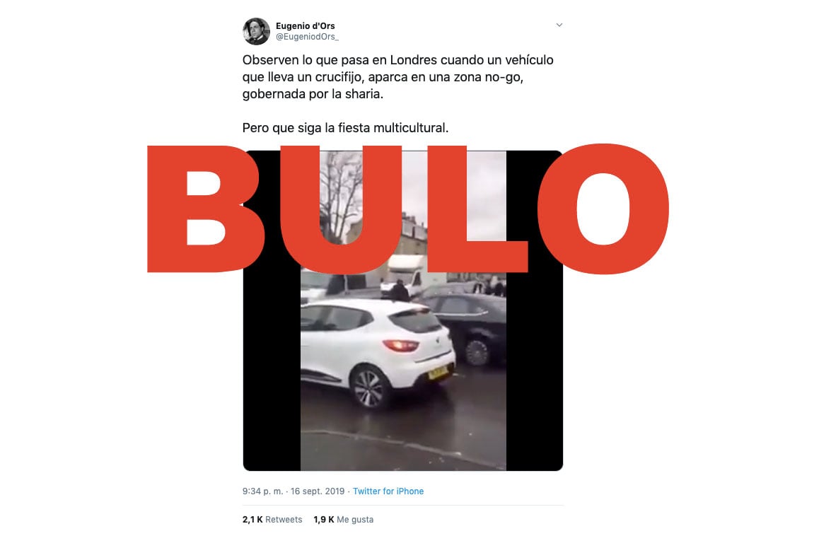 Se ha viralizado en Twitter un vídeo que supuestamente muestra la agresión por parte de un grupo de jóvenes a un hombre que llevaba un crucifijo en su vehículo, y que fue grabado "en una zona no-go, gobernada por la sharia" en Londres, pero no hay ninguna prueba de ello.