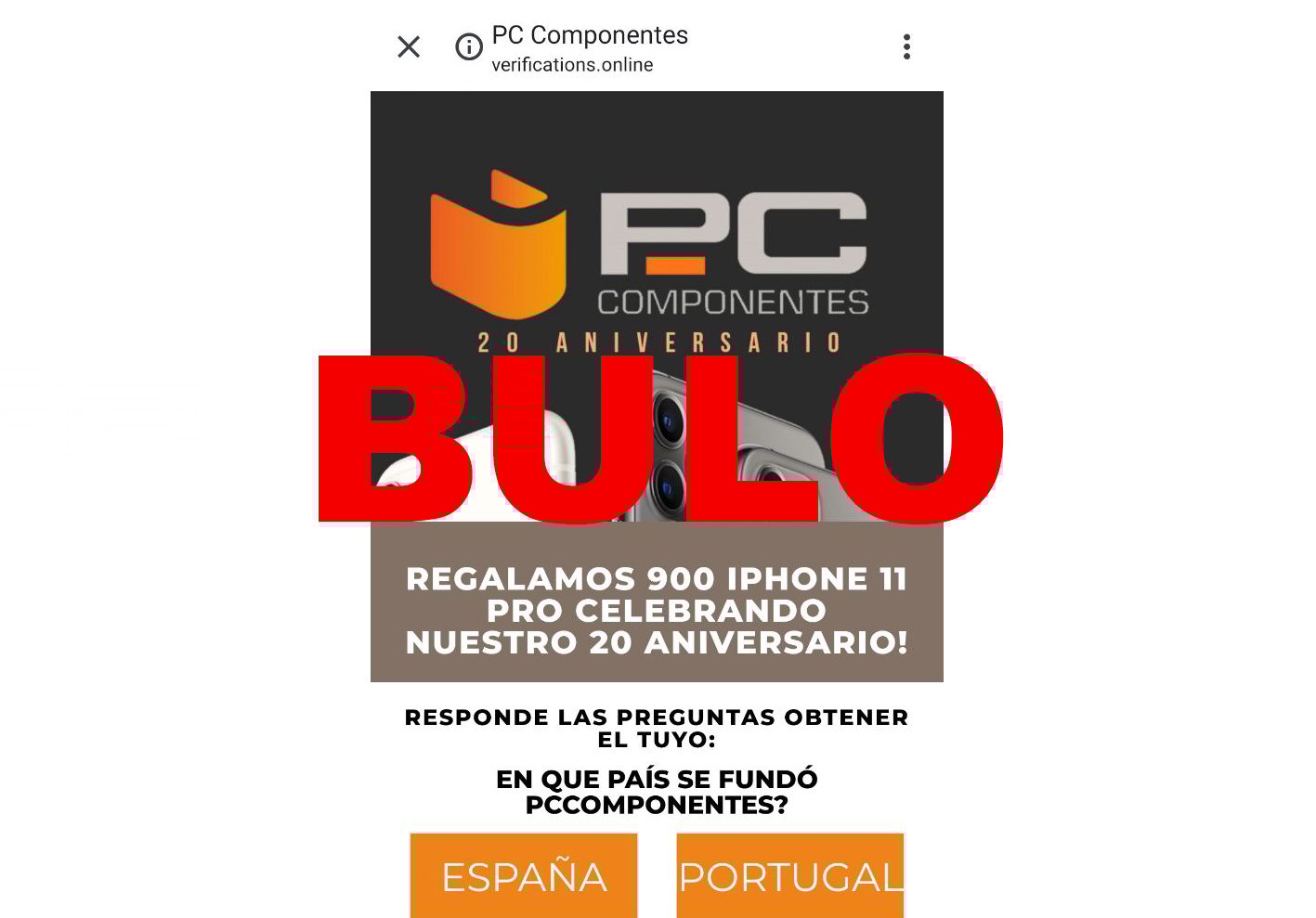 El mensaje que ha estado circulando afirma que por el 20 aniversario de la página PcComponentes, esta está regalando 900 unidades de iPhone 11, que salió a la venta el pasado 20 de septiembre en España. En este mensaje se anima a que participes y des tus datos. Sin embargo, la empresa de tecnología ya ha desmentido que estén regalando estos móviles y afirma que el enlace que aparece en el mensaje es de una web "totalmente ajena a PcComponentes".