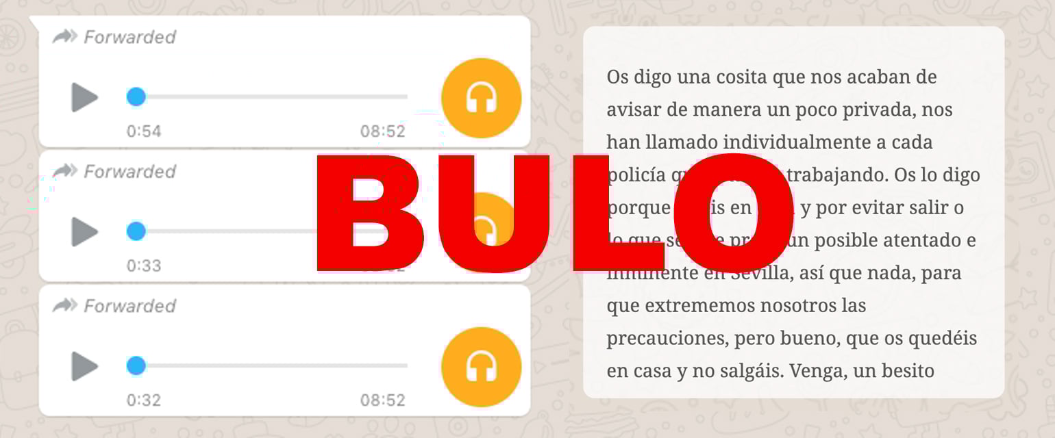 Este fin de semana tres audios han circulado sin parar por WhatsApp alertando de un "atentado inminente" en Sevilla. En estos audios, dos de los cuales pertenecen a la misma persona, se asegura que la policía ha sido informada de que se prevé un atentado en la ciudad de Sevilla e insta a la gente a no ir a "sitios turísticos y aglomeraciones". Es un bulo: desde la cuenta oficial de Emergencias del Ayuntamiento de Sevilla lo han desmentido.