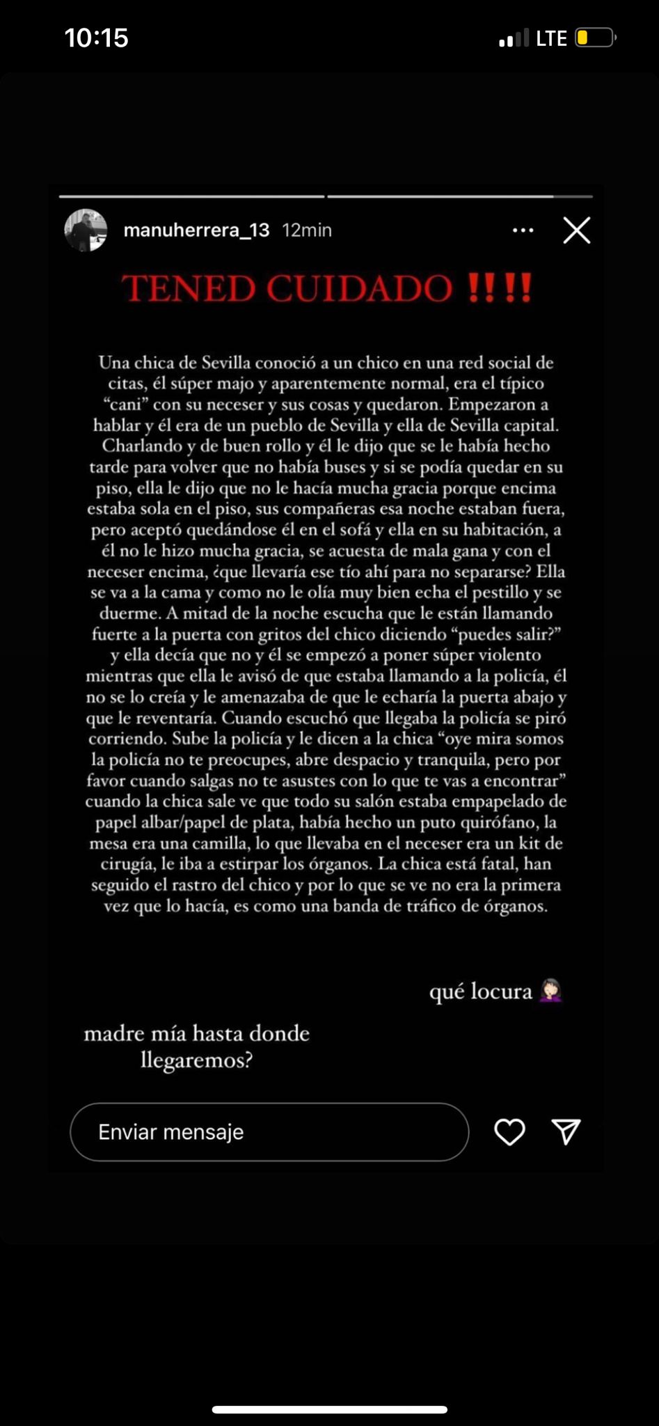 "A las 3 de la mañana ella se despertó [...], se notó que estaba super drogada y llamó a la policía. Fue la policía y cuando entró en el salón se encontró al tío que había plastificado todo el salón, los muebles, el suelo... todo. Y tenía, en una mesa colocados, cuatro cuchillos ordenaditos. Yo no sé si la iba a descuartizar, si se la iba a cargar, si la iba a violar..."