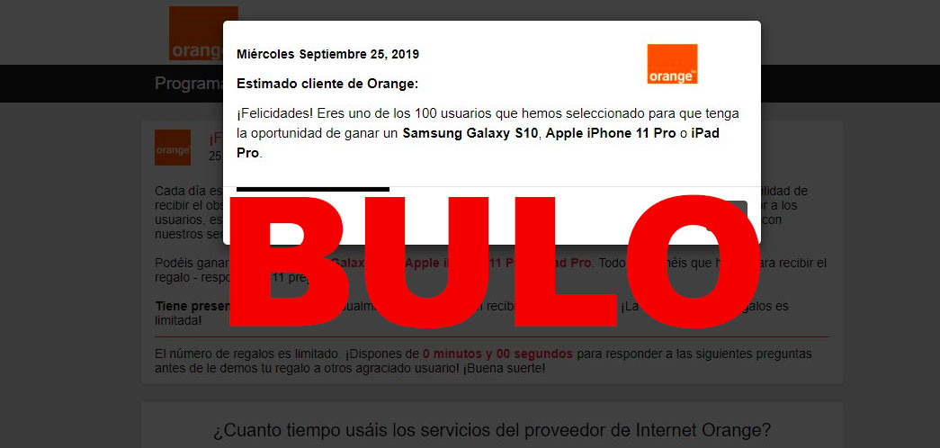 Además, la URL de las páginas a las que te van redirigiendo no son en ningún caso las oficiales de Orange. Otra cosa que debe llamarte la atención en estas situaciones es cómo está redactada la supuesta promoción. En este caso, tienen faltas de ortografía y frases sin sentido como: "Cada día escogemos por casualidad algunos usuarios para la encuesta. En cambio les proponemos la posibilidad de recibir el obsequio".