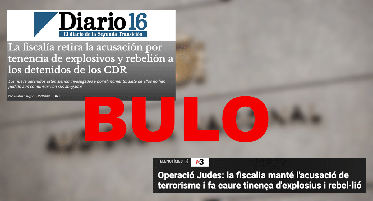 Además, la Audiencia Nacional ha confirmado a Maldita.es que los detenidos siguen acusados por el delito de tenencia de explosivos, a fecha de 27 de septiembre de 2019 a las 11:30 de la mañana, pero no del delito de rebelión con el que se les acusó cuando fueron detenidos.