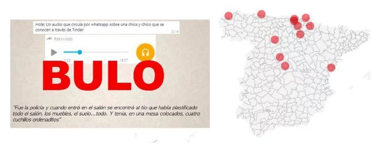 Está circulando mucho en distintas zonas de España un audio en el que se asegura que una mujer estuvo a punto de ser descuartizada por un hombre con el que había quedado a través de la aplicación de citas Tinder. Es un bulo que se está moviendo por Vitoria, Llodio, San Sebastián, Bilbao, La Rioja, Pamplona, A Coruña, Madrid, Las Rozas, Palencia, Castellón, Gijón, Segovia, Teruel, Valencia y Santander. La Policía Nacional nos ha dicho que no tiene constancia de que haya ocurrido en España.