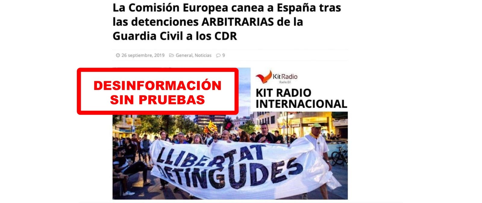 La web Kit Radio publicó el pasado 26 de septiembre un contenido en el que aseguraba sin aportar ninguna prueba que la Comisión Europea y la canciller alemana, Angela Merkel, habían recriminado al Gobierno "las detenciones arbitrarias de la Guardia Civil a los CDR", en relación a las personas vinculadas a los Comités de Defensa de la República que fueron detenidas el pasado 23 de septiembre. Es una desinformación, un contenido falso sin pruebas: la Comisión Europea, el Ministerio de Justicia y el Gobierno de Alemania nos lo desmienten.*