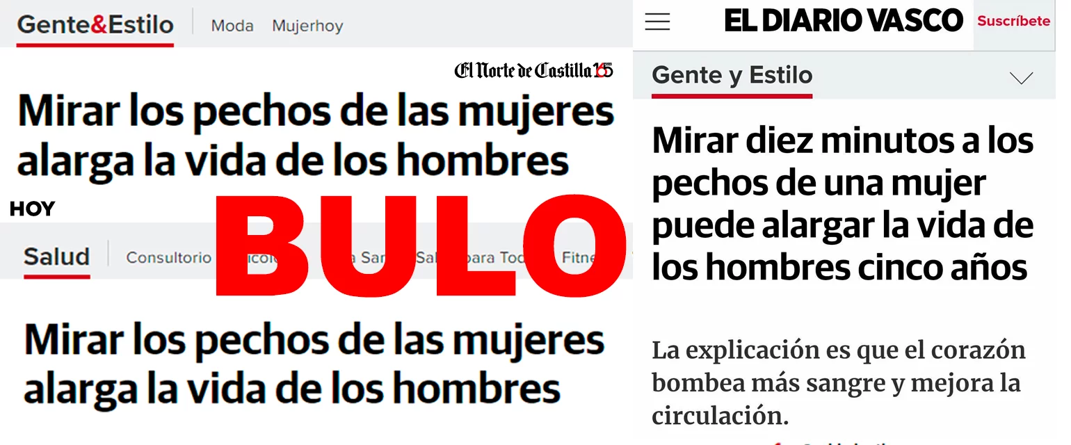 Nos habéis enviado una captura de pantalla de una pieza de El Diario Vasco que circula por las redes sociales y que dice que "mirar diez minutos a los pechos de una mujer puede alargar la vida de los hombres cinco años" según un estudio "publicado en la revista New England Journal of Medicine". Es un bulo.