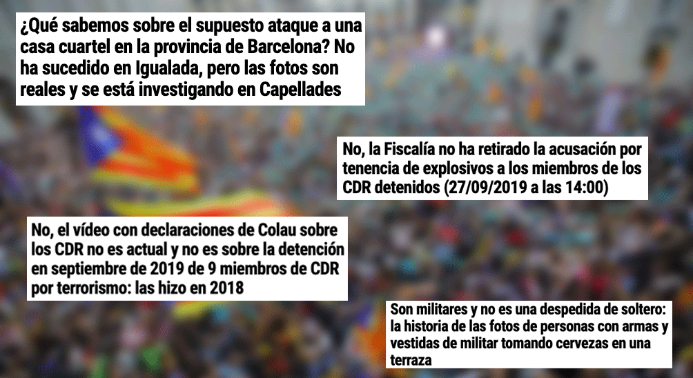 En los últimos días se han empezado a viralizar varias desinformaciones relacionadas con Cataluña, coincidiendo con el segundo aniversario del referendum unilateral del 1 de octubre de 2017. Algunas de ellas están relacionadas con la detención el pasado 23 de septiembre de varias personas vinculadas a los Comités de Defensa de la República (CDR), mientras que otras hacen referencia a supuestos incidentes ocurridos recientemente, como la fotografía de varios militares españoles sentados en una terraza de Cataluña