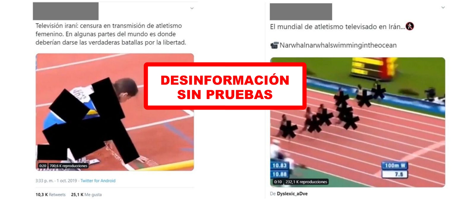 Circula un vídeo de una carrera de 100 metros lisos femeninos en el que las atletas salen 'censuradas' por marcas y asteriscos negros en la supuesta transmisión de la televisión iraní. El vídeo no corresponde a ningún Mundial de Atletismo como también se dice. No hay pruebas de que haya sido emitido por la televisión iraní.*