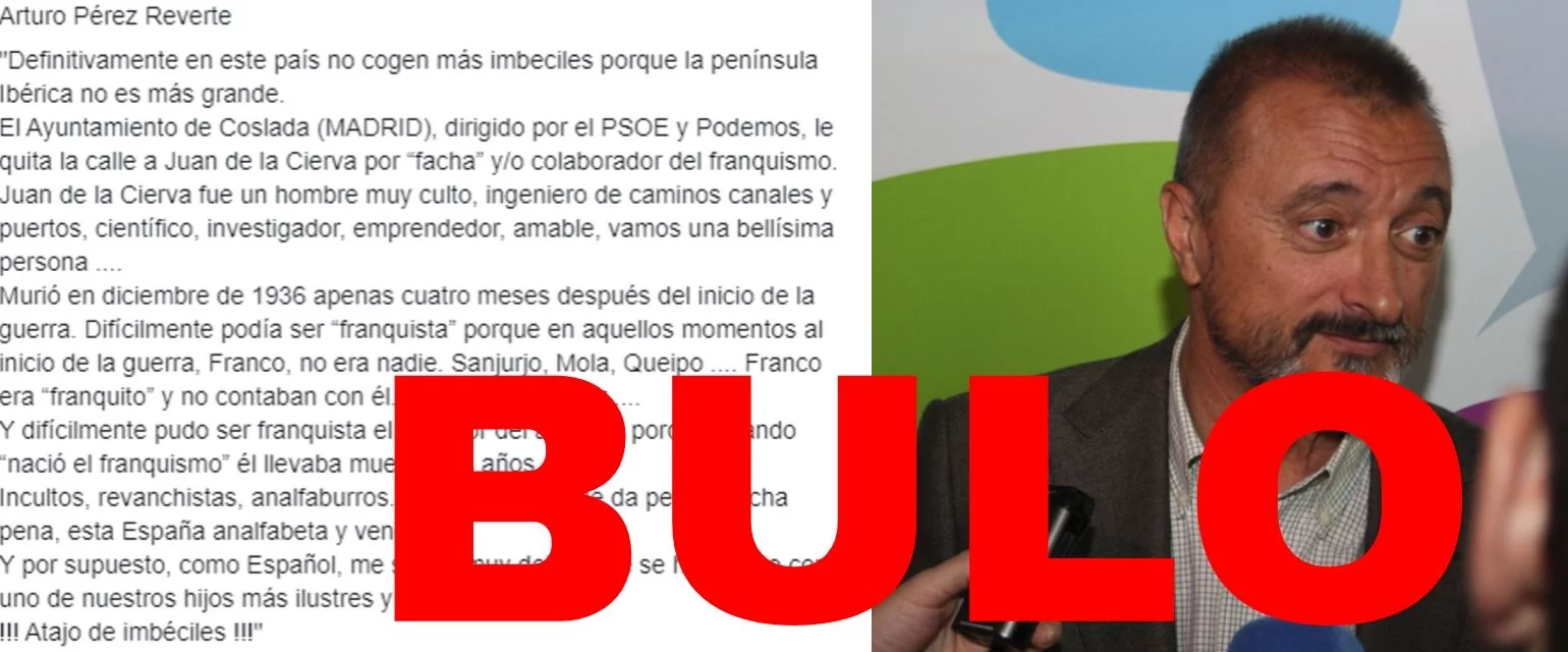 El propio Pérez-Reverte nos lo ha desmentido a través de Twitter. Además, no hay ningún tuit o artículo suyo publicado en medios de comunicación sobre la retirada de calle a Juan de la Cierva.