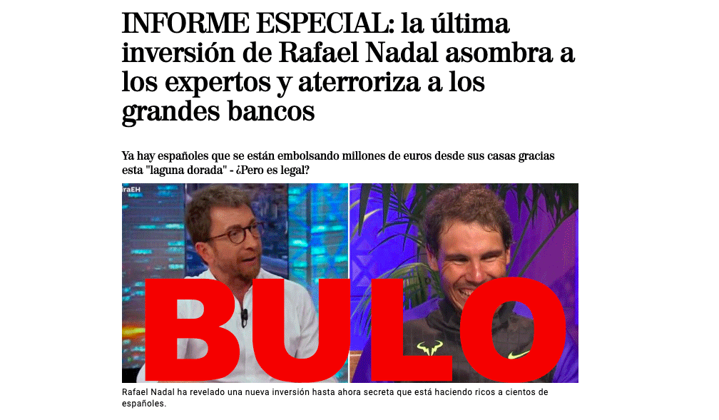 Uno de los últimos que ha sido utilizado para esta cuestión ha sido el tenista Rafa Nadal, que según el timo recomendó invertir en 'Bitcoin Code'. Aunque sí que ha acudido a El Hormiguero, no mencionó en ningún momento ese supuesto producto financiero.