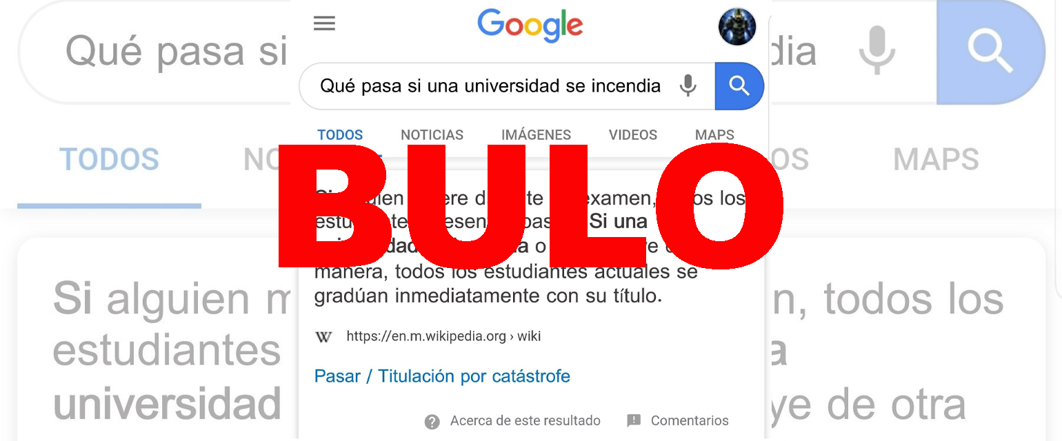 Además, si buscas dentro de la Wikipedia las frases "si una universidad se incendia" o "pasar/titulación por catástrofe" que es el supuesto título del supuesto artículo, este contenido no aparece publicado.
