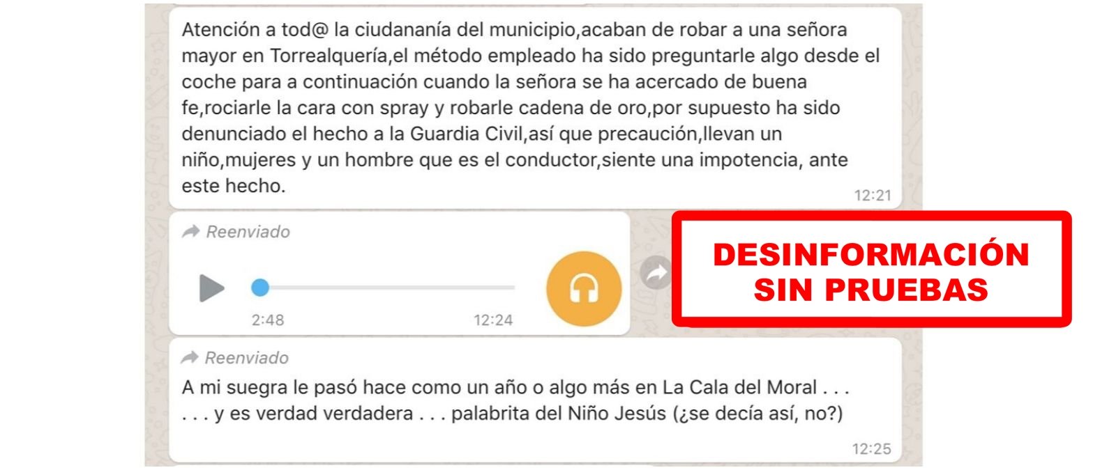 Circula por WhatsApp un audio de 2 minutos y 48 segundos de duración en el que una mujer cuenta cómo a otra mujer que vive en Torremolinos (Málaga) le han robado con el uso de un pañuelo que tenía la droga burundanga. No hay pruebas de que haya ocurrido: ni el Ayuntamiento de Torremolinos, ni el Ayuntamiento de Alahurín de la Torre (del que depende Torrealquería) ni la Policía Nacional de Málaga tienen constancia. Tampoco la policía de Cártama y Alahurín el Grande, donde también se afirma que ha sucedido, tienen constancia de ningún hecho similar.*