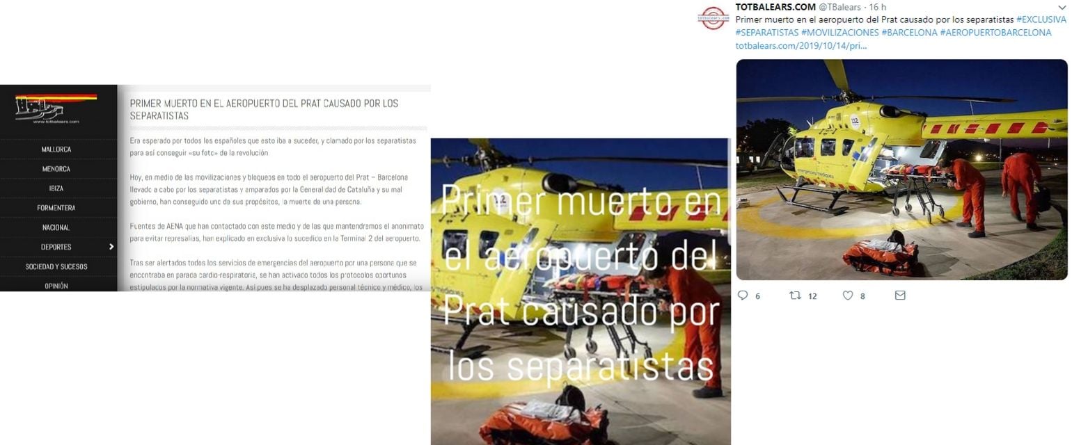 La web totbalears.com publicó el 14 de octubre que había habido un "primer muerto en el Aeropuerto del Prat causado por los separatistas". El contenido decía, citando supuestas fuentes de Aena, que una persona entró en parada cardiorrespiratoria, se activó el envío de una ambulancia pero no pudo "acceder por los bloqueos que han provocado los separatistas resentidos por la sentencia". En cambio, según totbalears.com el Sistema de Emergencias Médicas desplazó un helicoptero medicalizado al aeropuerto y fue desplazado a un hospital, aunque no fueron capaces "de recuperar los signos vitales del paciente", según el contenido de totbalears.com. Esto es lo que sabemos: