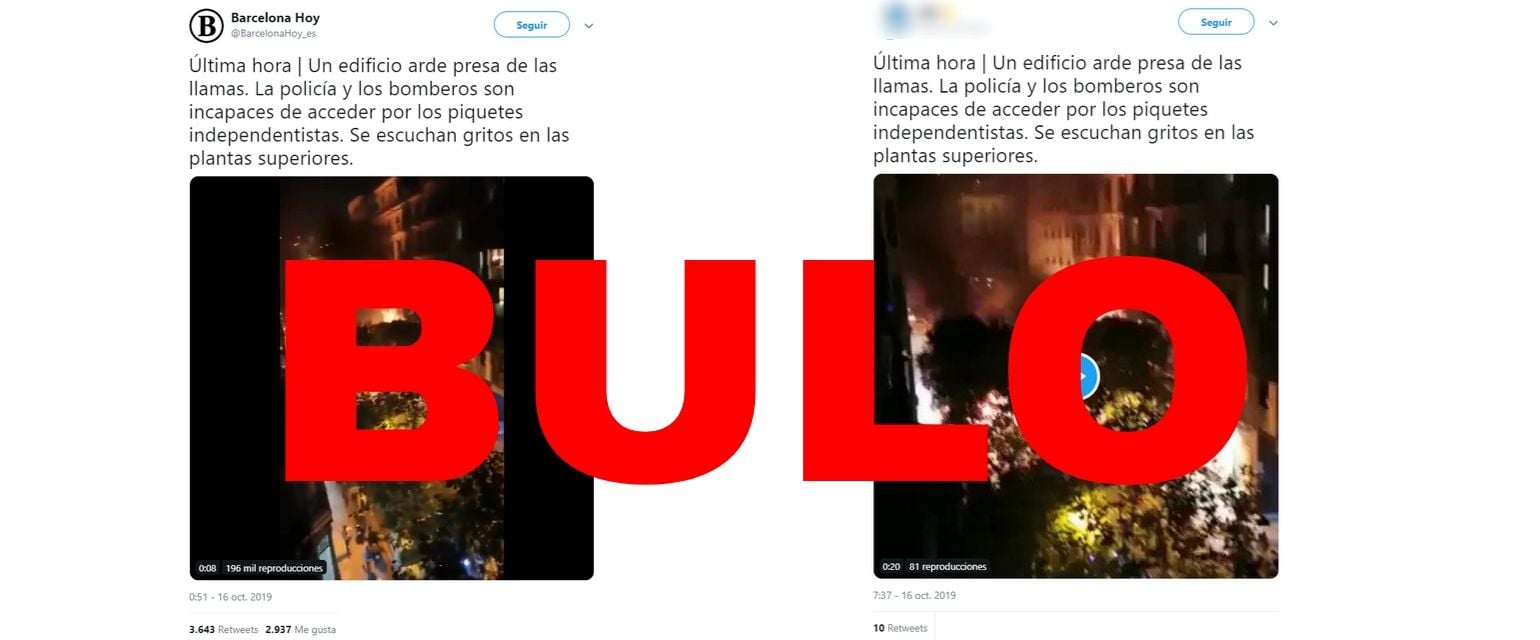 "Un edificio arde presa de las llamas. La policía y los bomberos son incapaces de acceder por los piquetes independentistas. Se escuchan gritos en las plantas superiores". Este mensaje se está viralizando acompañado de un vídeo de un incendio en la calle sobre los disturbios ocurridos el 15 de octubre en Barcelona. Es un bulo que ardiese ningún edificio en Barcelona durante los disturbios.