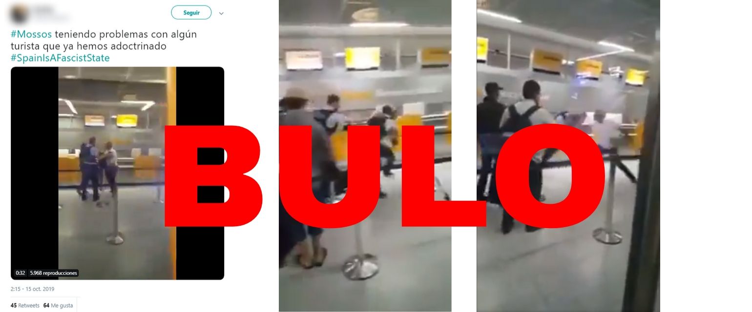 Circula en redes sociales un vídeo en el que se ve a un hombre enfrentándose a dos policías en un aeropuerto, del que se afirma que son Mossos los agredidos. También nos habéis preguntado si es un pasajero de Dubai que ha perdido su vuelo por las protestas en Cataluña por la sentencia de la sentencia del 'procés'. Es un bulo.