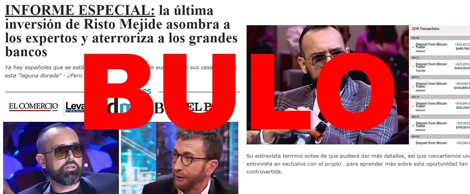 Esa vez han usado al presentador de televisión Risto Mejide, quien según el timo habló del dinero que había ganado a través de 'Bitcoin Era', pero eso no ha ocurrido: Risto Mejide no ha hablado en El Hormiguero de 'Bitcoin Era' ni hay pruebas de que haya invertido allí.