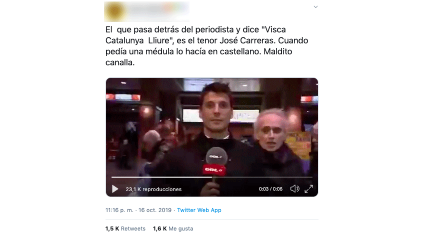 Se ha viralizado un vídeo en el que un periodista de GOL TV está a punto de entrar en directo tras un partido del FC Barcelona cuando, justo por detrás, pasa un hombre que grita "visca Catalunya lliure", al que varias publicaciones en redes identifican como el tenor Josep Carreras. Aunque es cierto que se trata de Carreras, el vídeo no es actual puesto que fue grabado hace diez años.