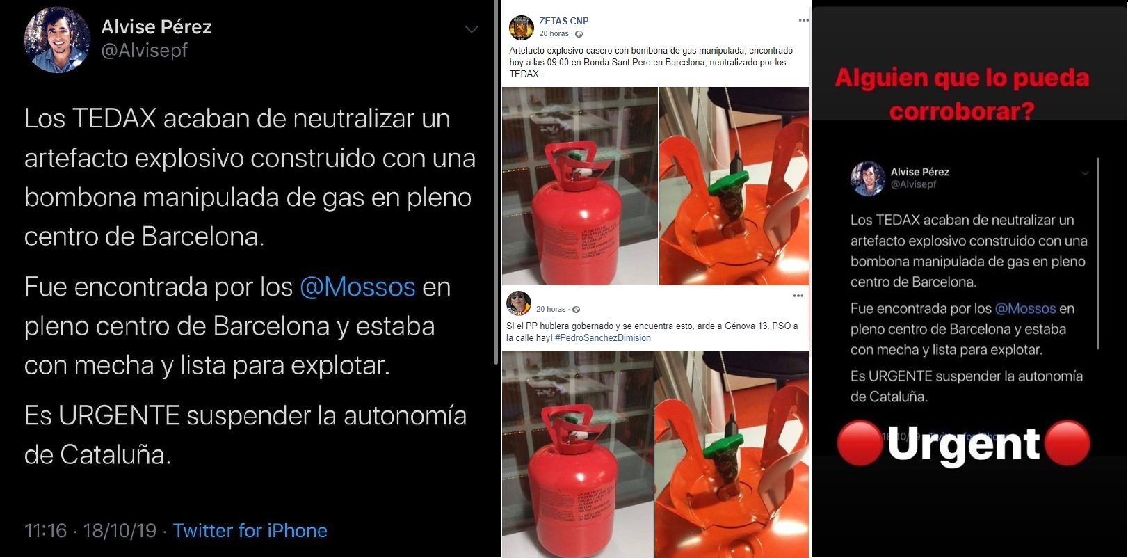 Se está moviendo un contenido masivamente por las redes con el siguiente texto: "Artefacto explosivo casero con bombona de gas manipulada, encontrado hoy a las 09:00 en Ronda Sant Pere en Barcelona, neutralizado por los TEDAX".